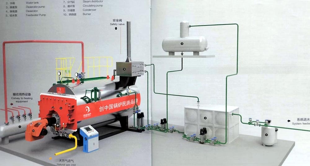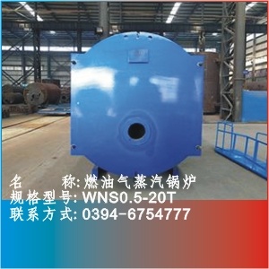 WNS型燃油气快装蒸汽锅炉采用卧式内燃二回程结构形式,燃烧方式采用微正压室燃。锅炉本体由锅筒、波形炉胆和回程螺纹烟管组成。锅筒内装有汽水分离装置和给水分配装置,下部装有定期排污装置,4t/h(含)以上装有表面排污装置。燃料在燃烧器内与空气混合后被电子点火棒点燃,喷入波形炉胆中燃烧,高温烟气由炉胆进入对流管束,*后由后烟箱通过烟囱排向大气。